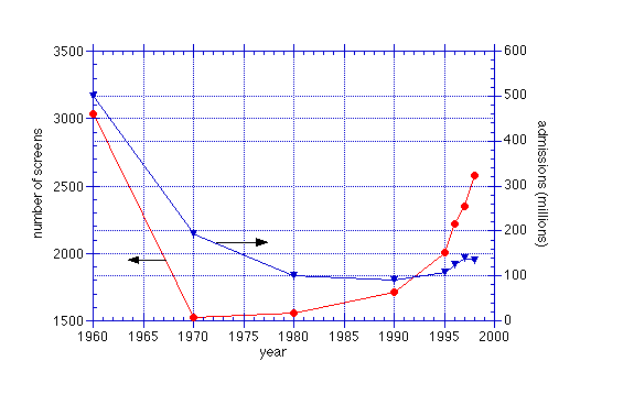 If the figures for total number of screens and total admissions are plotted one can postulate some interesting trends. The number of screens and the number of admissions falls to 1970. Could the cinema attendances be increased by more cinemas with better provision for the customers? More are built. The cinema experience is further enhanced by better choice of films and extensive restaurant and other services. However, it takes till 1990 before the falling attendances are reversed. Cinema building is now a frenzied activity (smaller units). Unfortunately not matched by continually expanding audiences - indeed the attendences flatten off and indeed show a small downward trend in 1998. Where will they go next? Up or down? Is this a Britain-wide phenomenon or are there local variations? Is London "under-cinemaed" as some have claimed? We'll keep a watching brief...