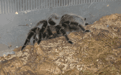 curled around the warming light in its enclosure The curly-haired tarantula