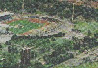 Clearly if such a huge development of the sports centre were to take place it would have an impact on other planning within Crystal Palace Park. If a "no-parking" approach were taken (similar to the Millennium Dome), thus relying solely on public transport, it would be a bold and welcome step amongst local people. (Picture - aerial view of the Crystal Palace sports stadium - Croydon Guardian 9/12/99 - click on picture for higher resolution, larger picture) |